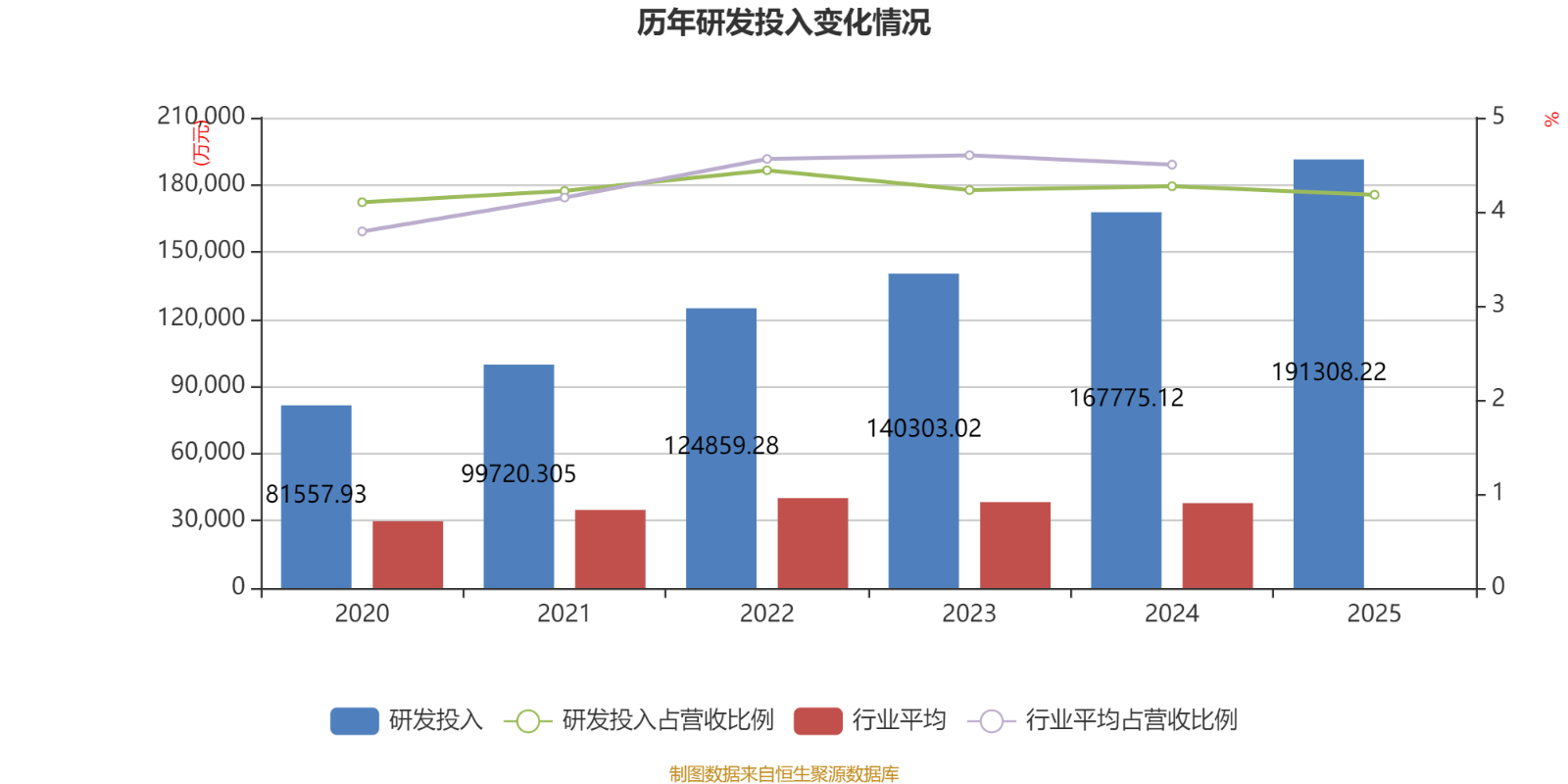 2025年全年,公司研发投入金额为19.13亿元,同比增长14.03%;研发投入占营业收入比例为4.18%,相比上年同期下降0.09个百分点。此外,公司全年研发投入资本化率为0%。