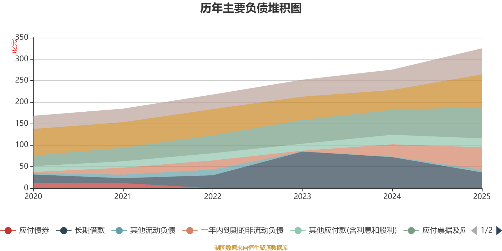 负债重大变化方面,截至2025年末,公司长期借款较上年末减少49.13%,占公司总资产比重下降6.17个百分点;短期借款较上年末增加65.84%,占公司总资产比重上升3.61个百分点;一年内到期的非流动负债较上年末增加83.59%,占公司总资产比重上升2.96个百分点;应付票据及应付账款较上年末增加25.08%,占公司总资产比重上升1.19个百分点。