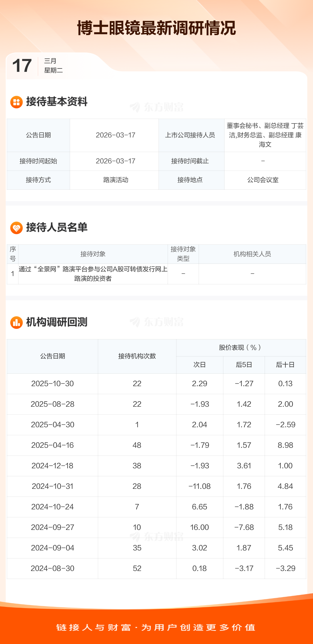 博士眼镜3月17日公告称,3月17日接待通过“全景网”路演平台参与公司A股可转债发行网上路演的投资者等1家机构调研。接待人员包括董事会秘书、副总经理 丁芸洁,财务总监、副总经理 康海文。
