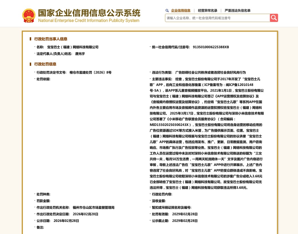 中新网3月17日电国家企业信用信息公示系统显示,近日,宝宝巴士(福建)网络科技有限公司,因广告妨碍社会公共秩序或者违背社会良好风尚行为,被福州市仓山区市场监督管理局罚款30万元、没收违法所得3.68元。