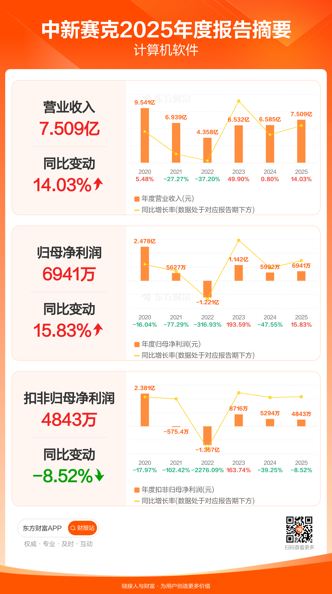 中新赛克3月18日发布2025年年报显示,公司全年实现营业收入7.51亿元,同比增长14.03%;归母净利润6941.07万元,同比增长15.83%;扣非归母净利润4842.97万元,同比下滑8.52%。每股EPS0.41元,低于机构一致预测的0.95元。