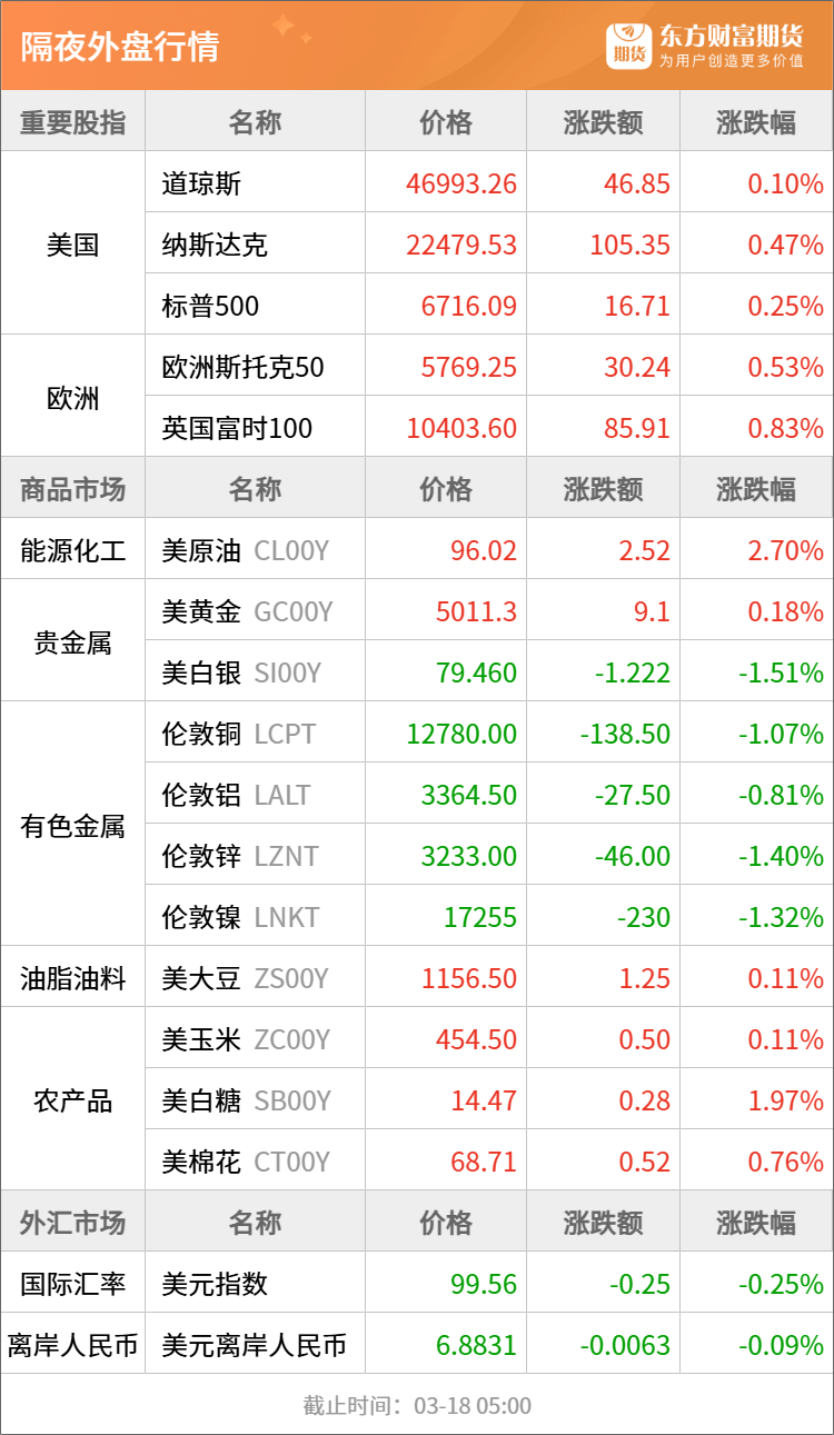 原油:3月17日,美国白宫国家经济委员会主任凯文·哈塞特表示,如有必要,全球协调战略石油储备释放规模可以扩大,期货显示油价将在今年晚些时候回到50多美元/桶。“我们非常有信心,目前局势已得到控制,且很快就会结束,”他补充道。(界面新闻)
