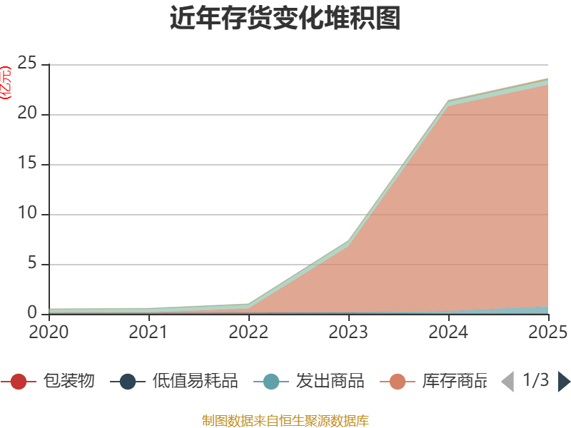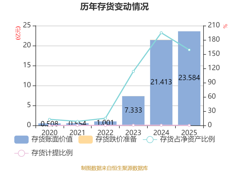 从存货变动来看,截至2025年末,公司存货账面价值为23.58亿元,占净资产的159.01%,较上年末增加2.17亿元。其中,存货跌价准备为51.22万元,计提比例为0.02%。