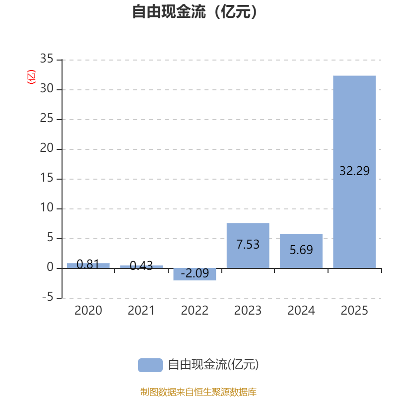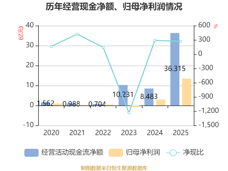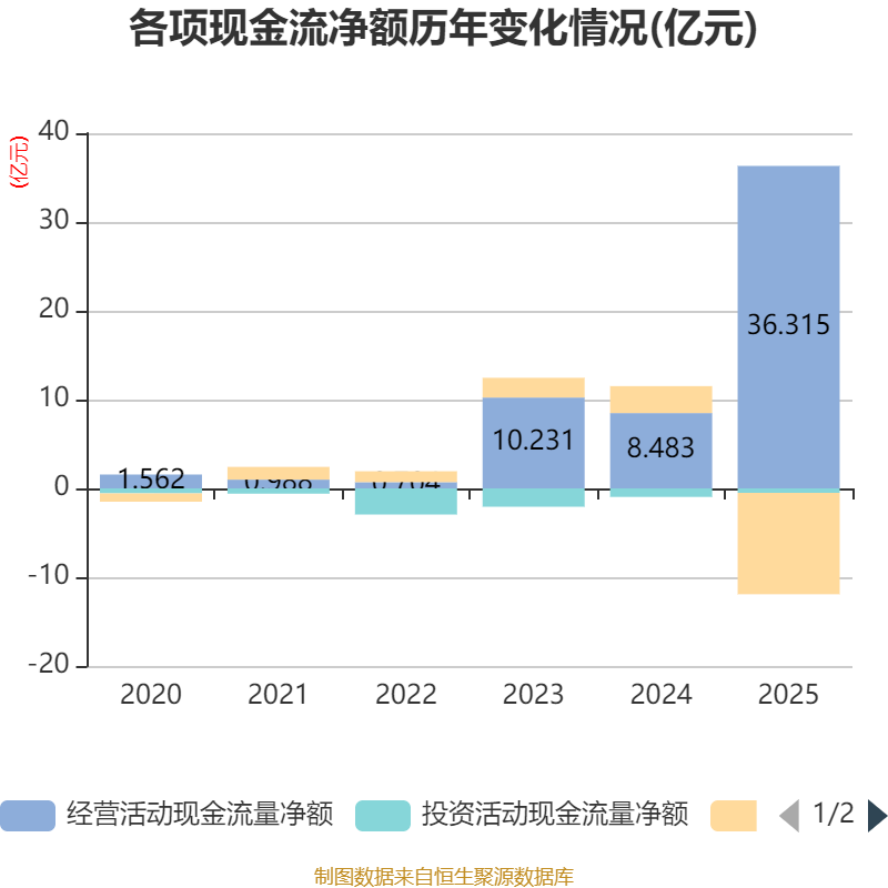 截至2025年,公司经营活动现金流净额为36.31亿元,同比增长328.07%;筹资活动现金流净额-11.42亿元,同比减少14.45亿元;投资活动现金流净额-5010.54万元,上年同期为-9621.23万元。