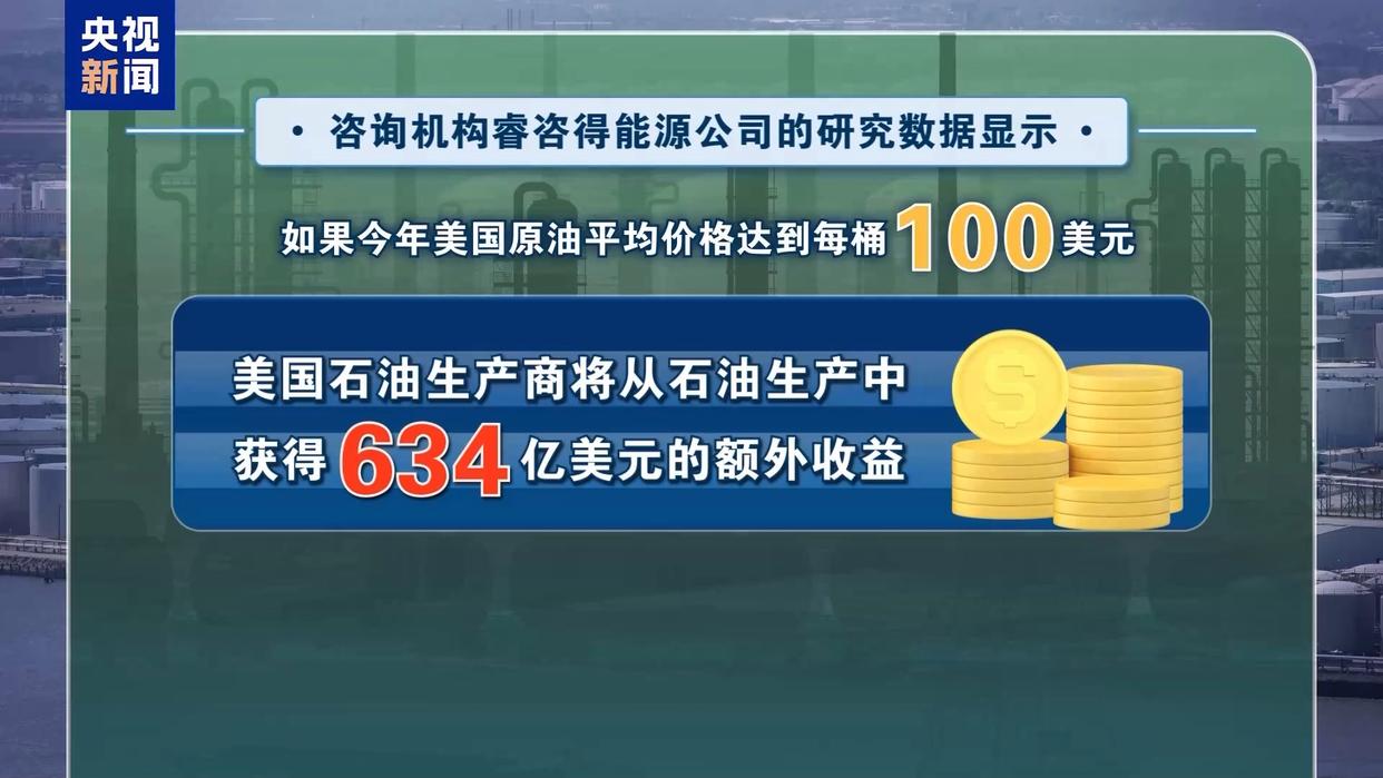 咨询机构睿咨得能源公司的研究数据进一步显示:如果今年美国原油平均价格达到每桶100美元,美国石油生产商将从石油生产中获得634亿美元的额外收益。上周五,美国西得克萨斯中质原油收于每桶98.71美元。12日,布伦特原油飙升突破100美元时,美国总统特朗普在社交媒体上直言:“作为如今全球最大的产油国,油价上涨意味着美国正在赚大钱。”