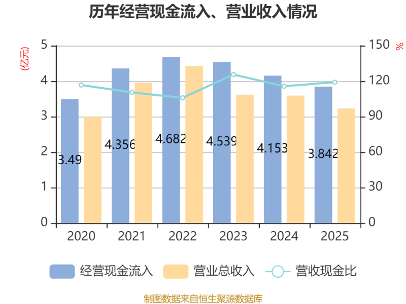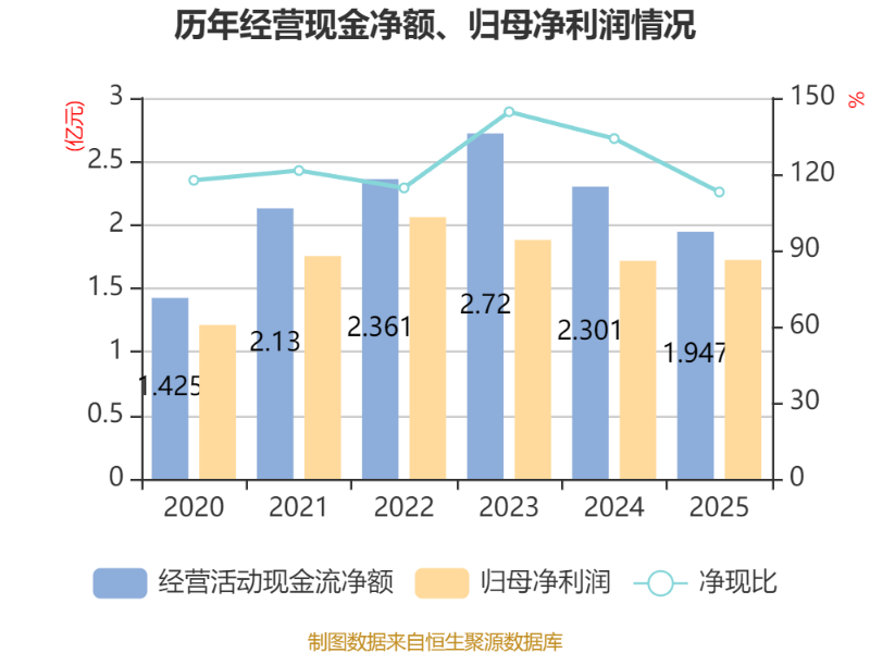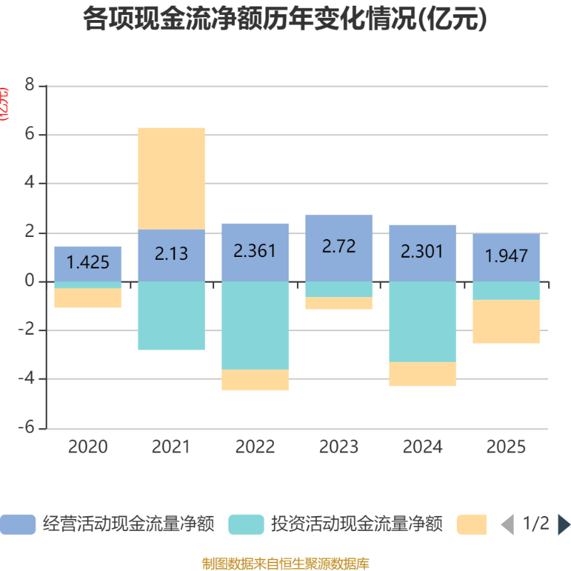 截至2025年,公司经营活动现金流净额为1.95亿元,同比下降15.38%;筹资活动现金流净额-1.77亿元,同比减少8000万元;投资活动现金流净额-7554.81万元,上年同期为-3.3亿元。