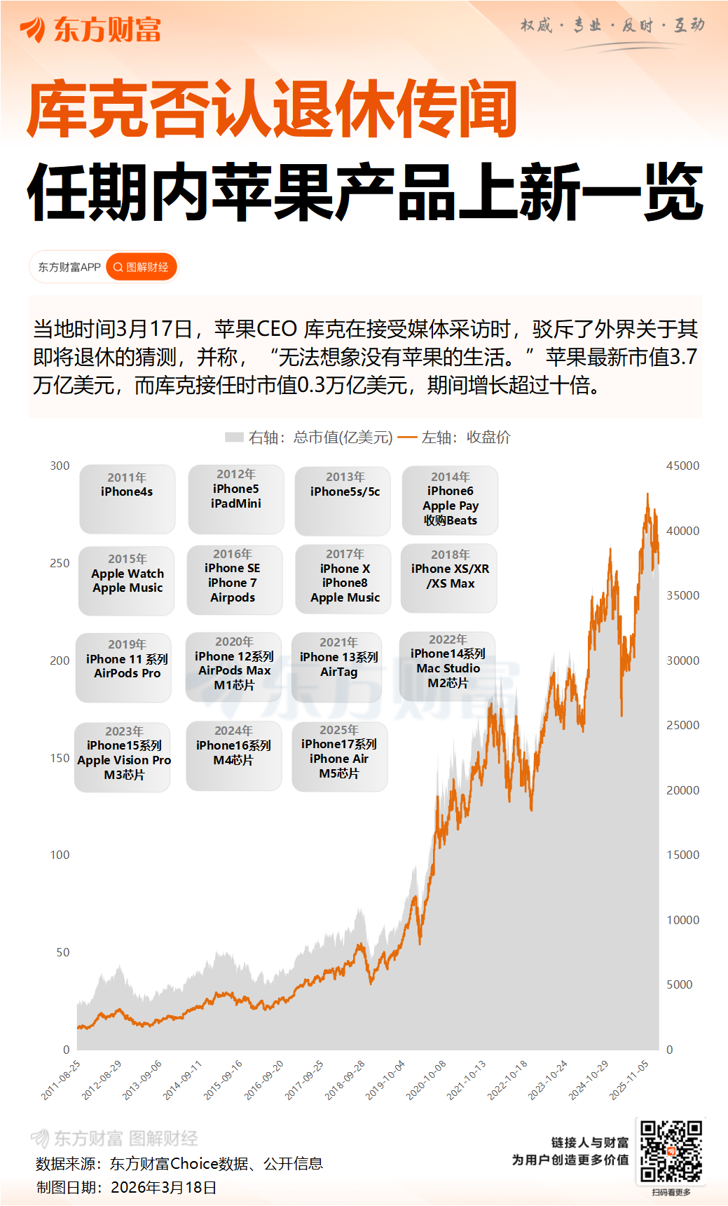 当被问及苹果过去50年来最大的贡献时,库克强调公司在多个行业的创新能力。“你可以聚焦于那些标志性产品时刻,比如重塑音乐产业、重新定义智能手机、将创意艺术与图形设计带入主流,以及通过手表挽救生命。”