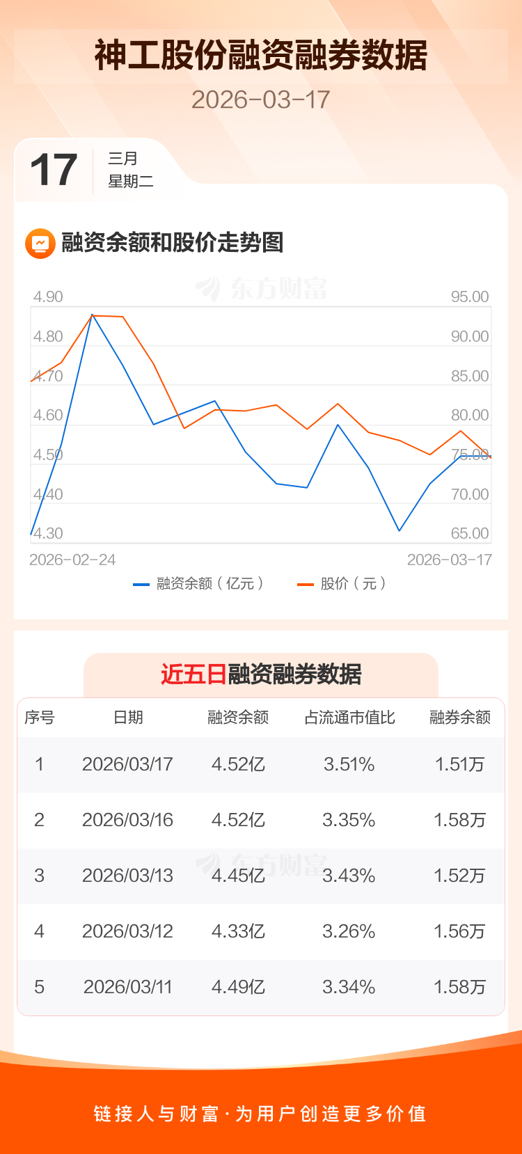 交易所最新数据显示,神工股份于2026年3月17日获融资买入3053.94万元,融资偿还3004.94万元,当日融资净买入49万元。目前,该股融资余额4.52亿,占流通市值比例为3.51%。
