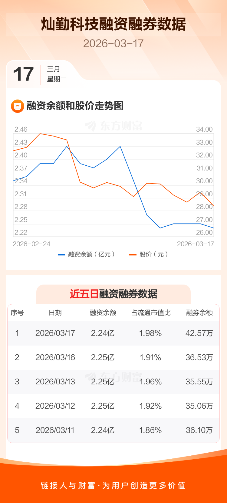 交易所最新数据显示,灿勤科技于2026年3月17日获融资买入626.81万元,融资偿还721.14万元,当日融资净偿还94.32万元。目前,该股融资余额2.24亿,占流通市值比例为1.98%。