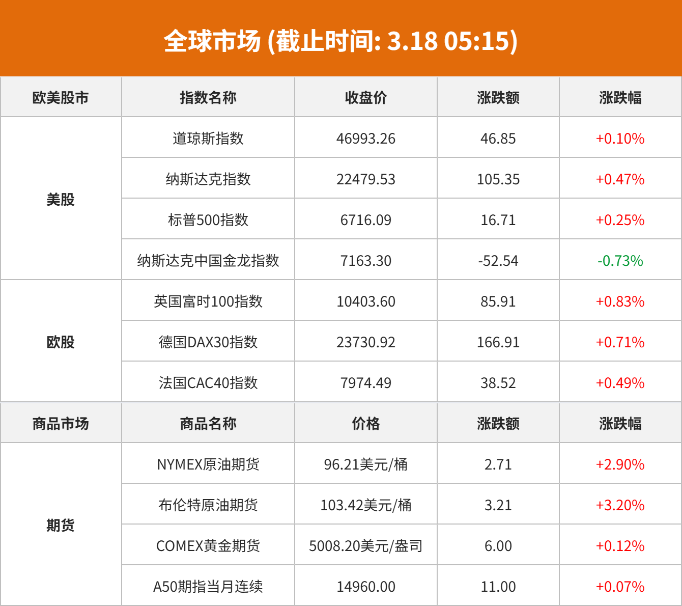 商品市场:国际油价03月17日上涨。截至当天收盘,纽约商品交易所WTI原油期货当月连续合约上涨2.52美元,收于每桶96.02美元,涨幅为2.70%。COMEX黄金期货当月连续合约上涨9.10美元,涨幅0.18%,报5011.3美元/盎司。COMEX白银期货当月连续合约下跌1.22美元,跌幅1.51%,报79.46美元/盎司。现货黄金下跌0.80美元,跌幅0.02%,报5005.75美元/盎司。现货白银下跌1.45美元,跌幅1.80%,报79.3美元/盎司。