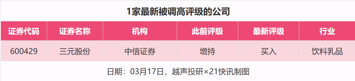 评级调高方面,3月17日,券商调高上市公司评级达到1家次,最新数据包括了中信证券对三元股份的评级从“增持”调高至“买入”。