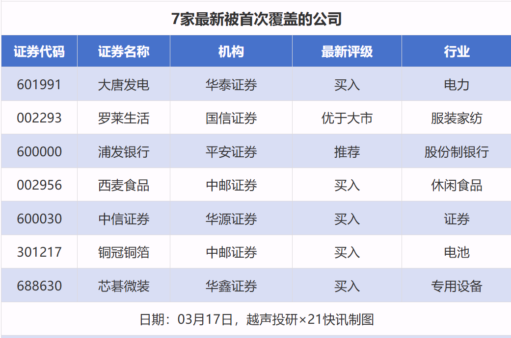 首次覆盖方面,3月17日券商共给出了7次首次覆盖,其中大唐发电获得华泰证券给予“买入”评级,罗莱生活获得国信证券给予“优于大市”评级,浦发银行获得平安证券给予“推荐”评级,西麦食品获得中邮证券给予“买入”评级,中信证券获得华源证券给予“买入”评级。