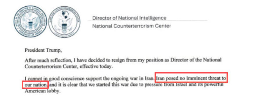 肯特在社交媒体上公布了他本人致特朗普的信件,他在信件中说:“凭良心讲,我无法支持正在进行的对伊战争。伊朗并未对我国构成迫在眉睫的威胁,很明显,我们发动这场战争是因为以色列及其强大游说力量施加的压力。”