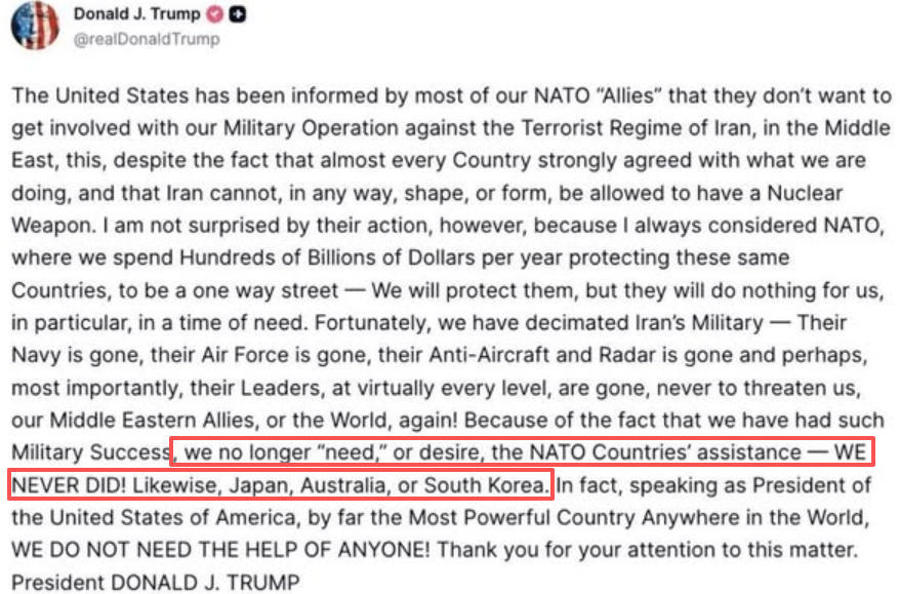 特朗普在文中明确写道:“他们(北约)不会为美国做任何事,尤其是在美国有求于他们的时候。”在文末,特朗普还提及对日本、澳大利亚以及韩国“情况亦是如此”。特朗普强调,他作为美国总统郑重声明:“我们根本不需要任何人的帮助。”