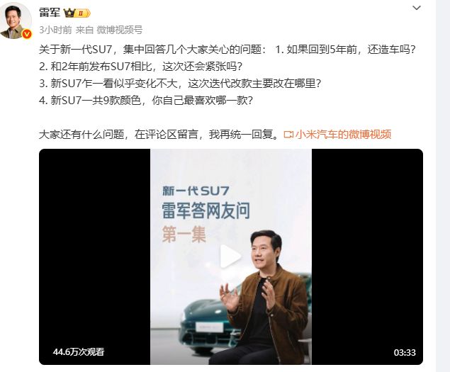 随后,3月16日午间,雷军再发微博,集中回答网友关心的新一代SU7的相关问题。“如果回到5年前的话,(我)还是会选择造车。”雷军坦言,“5年前,所有人都说造车很难,我们做了大量调研,发现造车确实不容易,所以做了很充分的准备。初期比想象中简单一点,但是随着造车进度(加快),觉得越来越难,越来越不容易。”