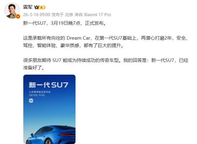 3月16日,雷军通过个人微博官宣新一代SU7将于3月19日晚正式发布(即上市)。“这是承载所有向往的Dream Car,在第一代SU7基础上,再潜心打磨两年,安全、驾控、智能体验、豪华质感,都有了巨大的提升。”雷军称,“很多朋友期待SU7能成为持续成功的传奇车型,我的回答是:新一代SU7,准备好了。”