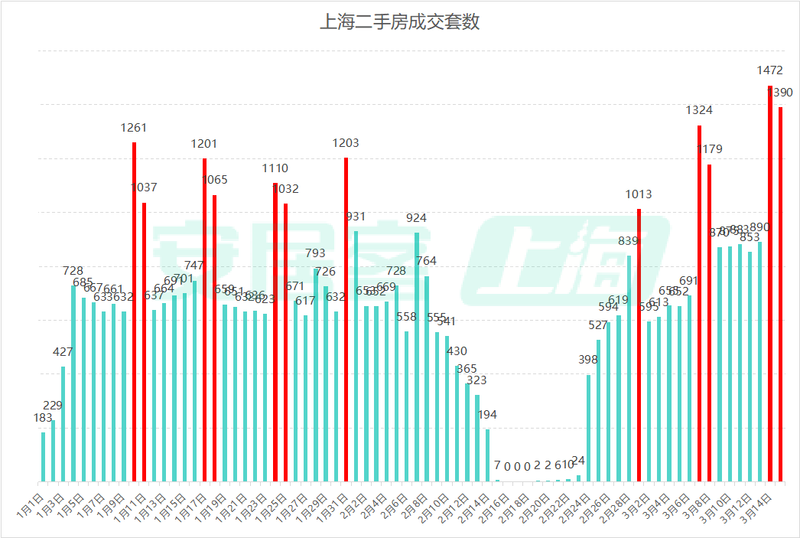 3月14日,上海二手房成交再冲高峰,单日成交1472套,逼近1500套大关,成交量高涨也使得上海二手房网签系统一度“瘫痪”。