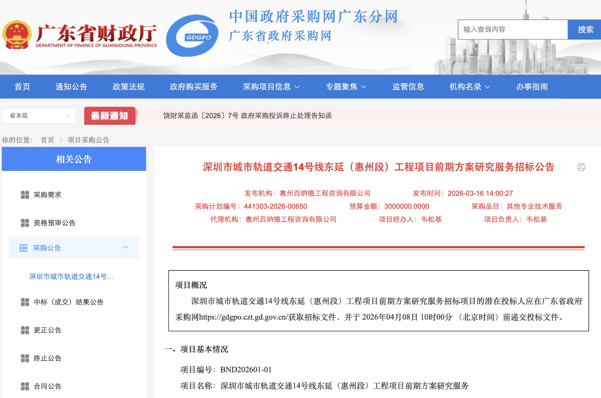 在此战略规划背景下,一项具体的跨市交通项目有了实质性进展。根据广东省政府采购网发布的《深圳市城市轨道交通14号线东延(惠州段)工程项目前期方案研究服务招标公告》,该项目的采购方式为公开招标,采购包预算金额为300万元,投标人应在广东省政府采购网获取招标文件,并于 2026年04月08日 10时前递交投标文件。
