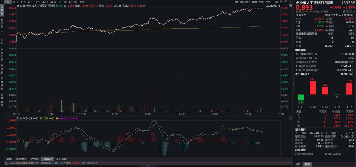 今日市场震荡调整背景下,创业板人工智能ETF国泰(159388)逆势走强,大涨超5%,呈现出显著的板块独立行情与资金青睐度。核心驱动来自事件催化、资金回流与板块估值修复三重共振:英伟达GTC 2026大会释放算力硬件、光模块、PCB、CPO等产业链强需求信号,直接提振AI硬件与算力环节景气预期;叠加前期板块回调后估值处于相对合理区间,资金借势布局高弹性标的,推动ETF快速上行;同时,场内资金持续净流入,近十日获明显净申购,交投活跃度提升,进一步放大上涨动能。
