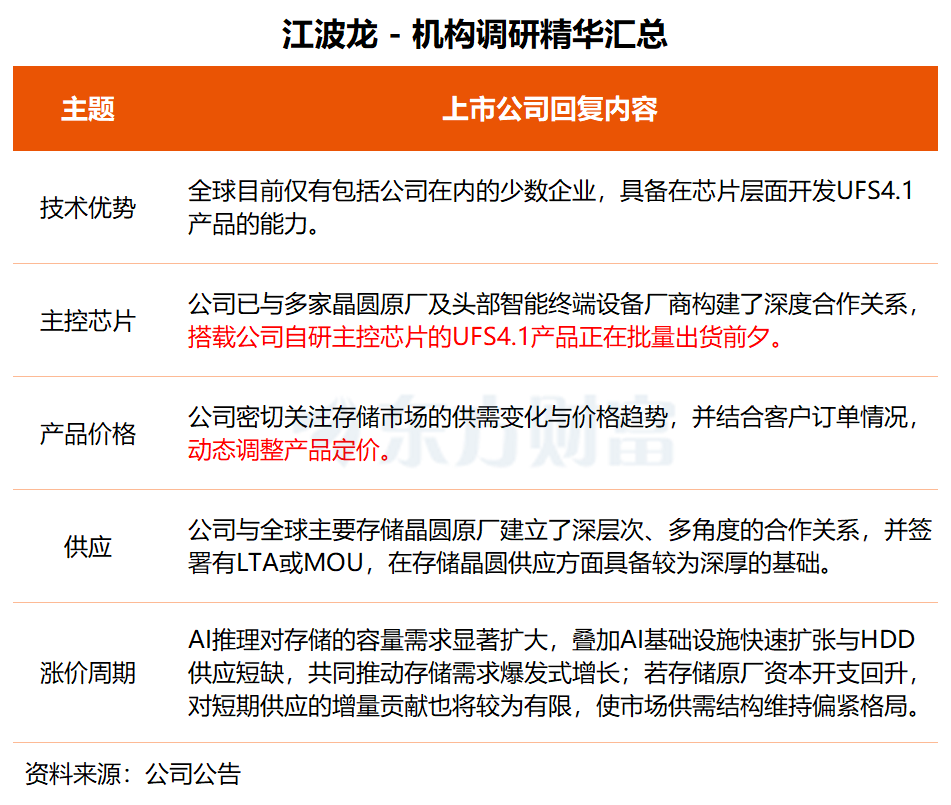 在调研中,江波龙透露,基于领先的主控芯片能力,公司已与多家晶圆原厂及头部智能终端设备厂商构建了深度合作关系,搭载公司自研主控芯片的UFS4.1产品正在批量出货前夕。