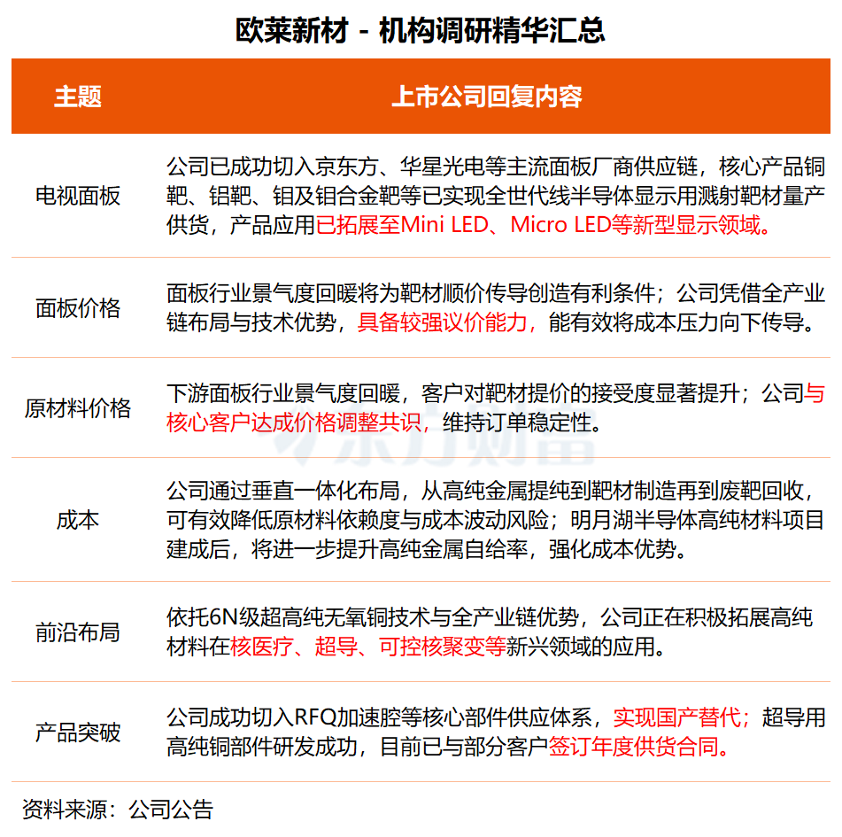 “面板行业景气度回暖将为靶材顺价传导创造有利条件。”欧莱新材称,公司凭借全产业链布局与技术优势,具备较强的议价能力,能够有效将成本压力向下游传导。