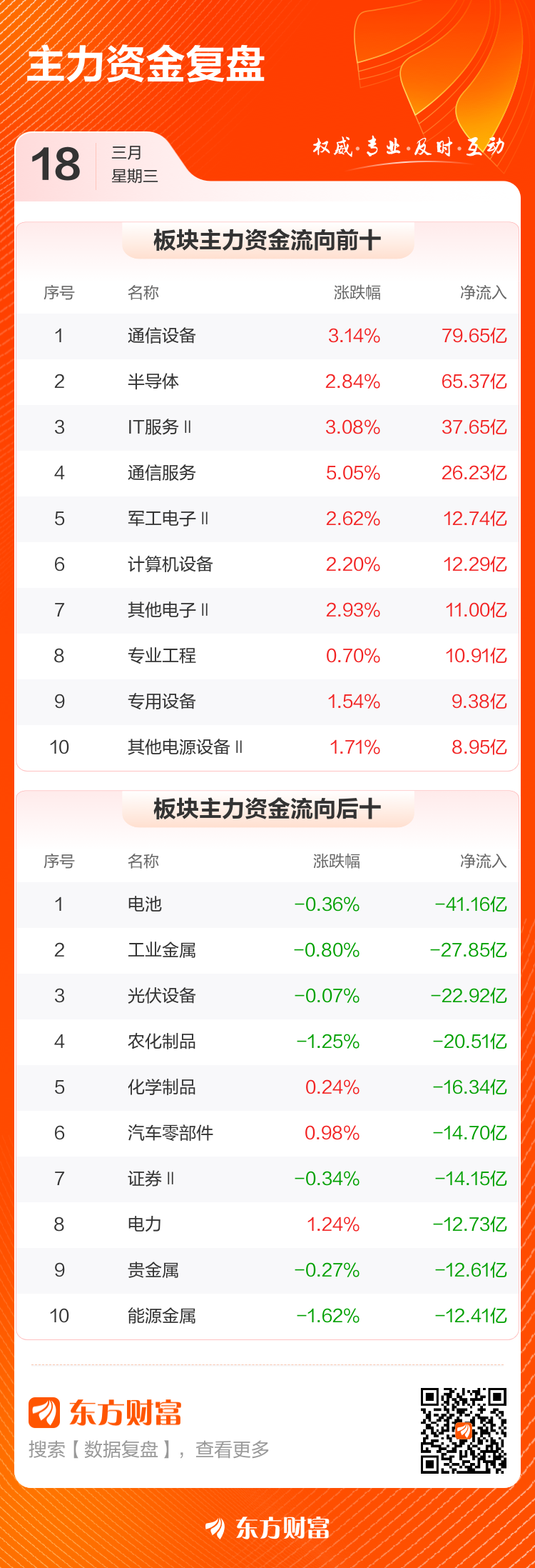 3月18日,沪指涨0.32%,深成指涨1.05%,创业板指涨2.02%。两市成交额2.05万亿,较上个交易日缩量1618亿。数据显示,今日大盘主力资金净流出48.37亿。通信设备、半导体、IT服务Ⅱ等板块主力资金流入排名居前,其中通信设备净流入79.65亿元。