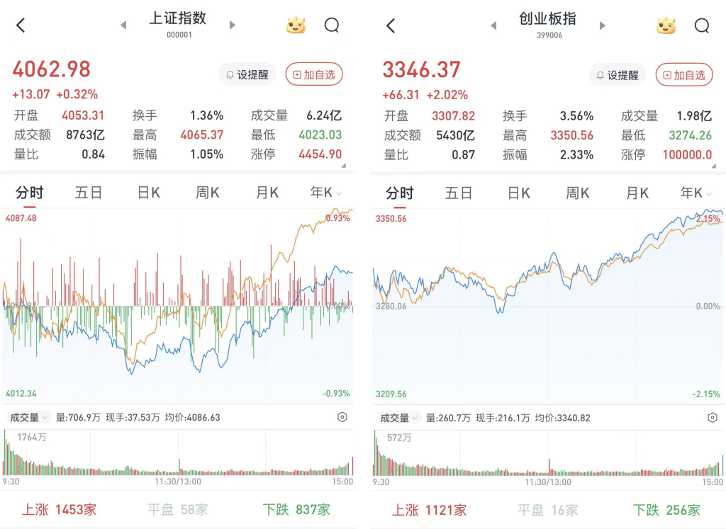 至收盘,上证综指涨0.32%,报4062.98点;科创50指数涨1.36%,报1372.58点;深证成指涨1.05%,报14187.8点;创业板指涨2.02%,报3346.37点。