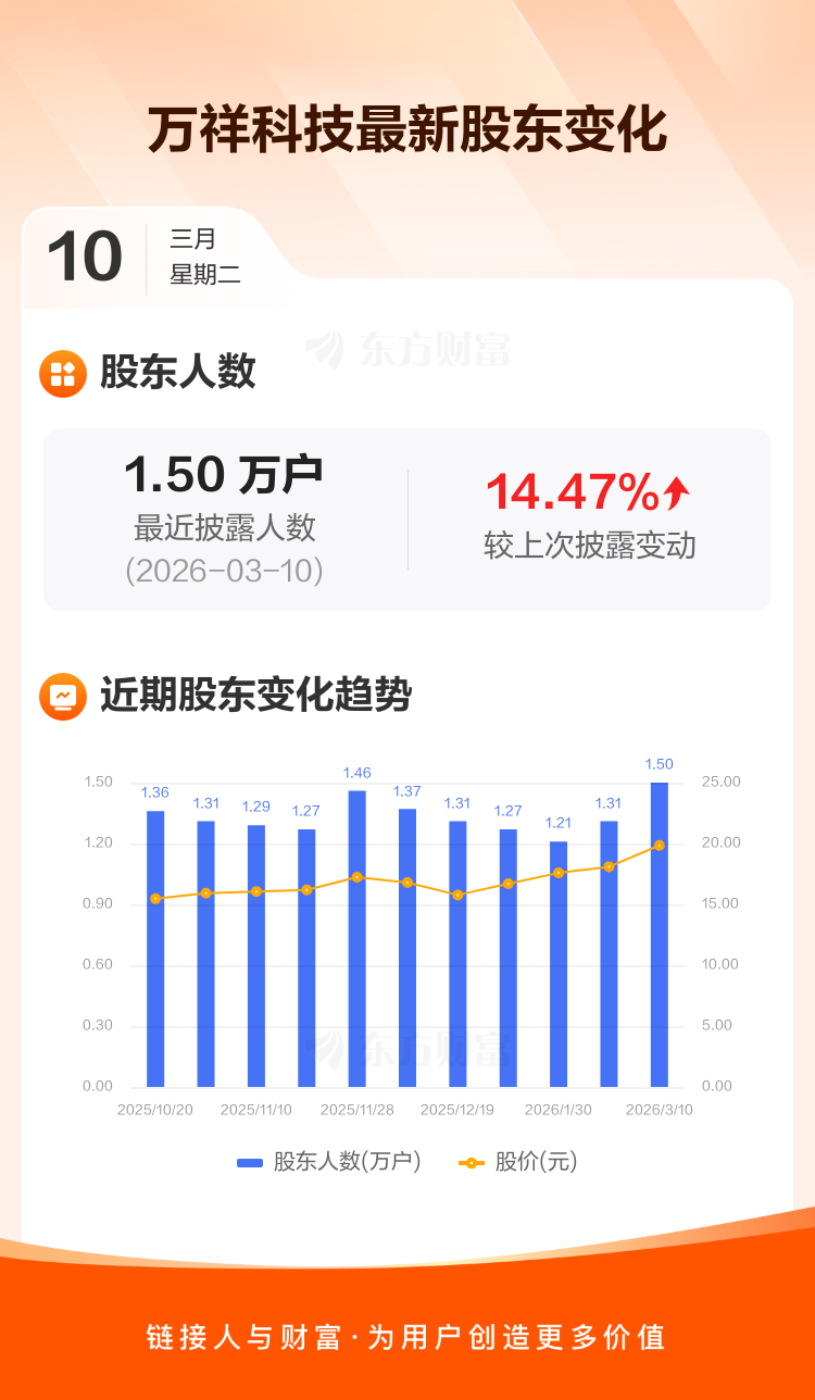 万祥科技最新披露数据显示,截至3月10日公司股东户数为1.50万户,较上期(2026年2月13日)增加1895户,增幅为14.47%。户均持有流通股数量由上期的1.25万股下降至1.09万股,户均持股金额由上期的22.67万元减少至21.72万元。