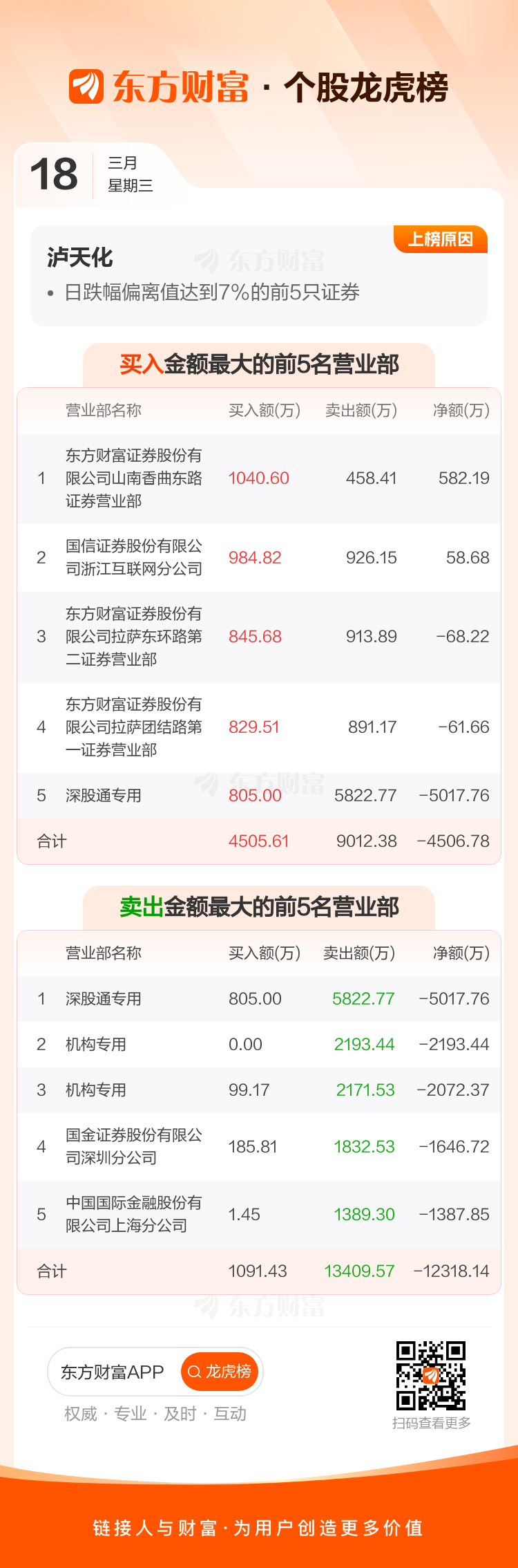 交易所2026年3月18日公布的交易公开信息显示,泸天化因成为日跌幅偏离值达到7%的前5只证券上榜。泸天化当日收报5.82元,涨跌幅-10.05%,偏离值-10.97%,换手率10.92%,成交额10.12亿。