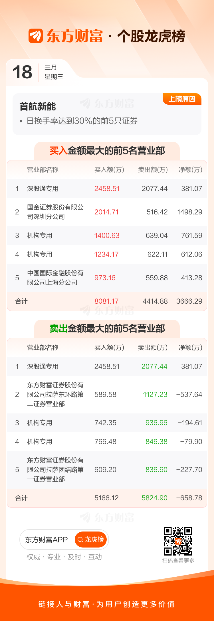 交易所2026年3月18日公布的交易公开信息显示,首航新能因成为日换手率达到30%的前5只证券上榜。首航新能当日收报48.3元,涨跌幅1.94%,偏离值42.95%,换手率42.95%,成交额8.74亿。