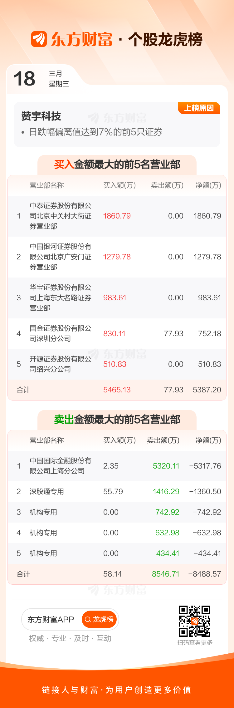 交易所2026年3月18日公布的交易公开信息显示,赞宇科技因成为日跌幅偏离值达到7%的前5只证券上榜。赞宇科技当日收报13元,涨跌幅-9.97%,偏离值-10.97%,换手率4.01%,成交额2.38亿。