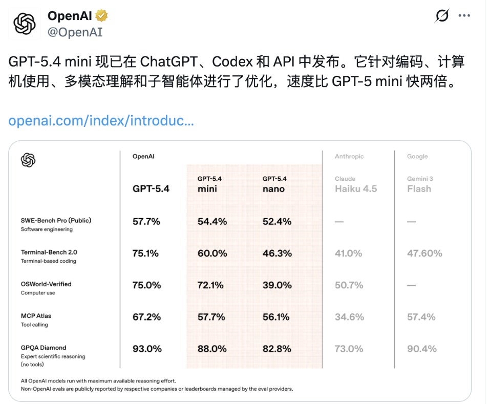 北京时间3月18日,OpenAI宣布推出两款小模型GPT5.4 mini与nano,官方称这是内部“迄今为止能力最强的小模型”,其能力接近旗舰模型GPT-5.4,但针对高频工作负载做了优化,旨在以更低延迟和更高性价比,为智能体时代的应用提供新选项。