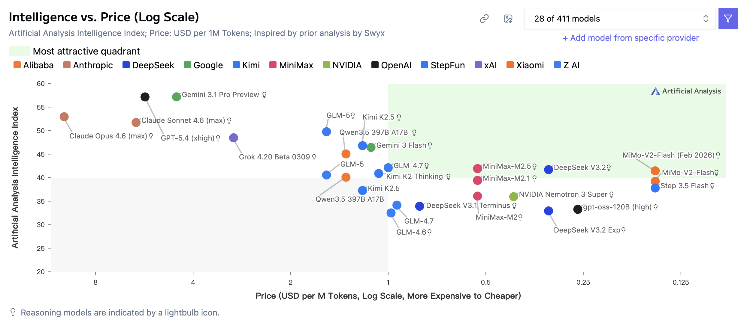 AI基准测试机构ArtificialAnalysis整理的一份大模型性价比排行榜可以作为参考,横轴是大模型的价格,竖轴是大模型的智能指数得分,象限的右上角绿色区域则是综合了智能与价格的性价比模型。可以看到,包括DeepSeek V3.2、MiniMax-M2.5等都在性价比较优的区间,此外Kimi、智谱的模型也接近这一象限。
