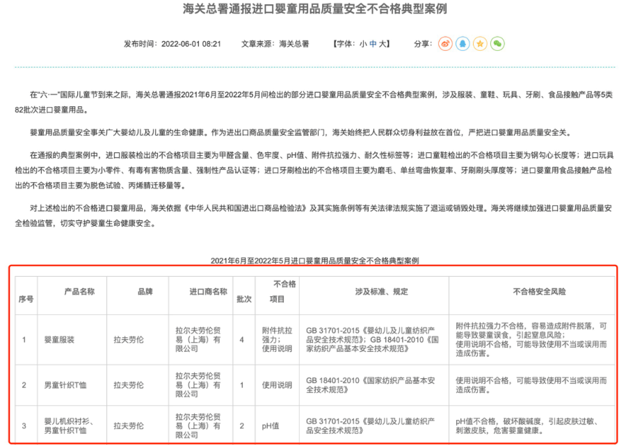 在海关总署2022年6月1日发布的《2021年6月至2022年5月进口婴童用品质量安全不合格典型案例》中,就已通报点名拉夫劳伦及ZARA。其中,拉夫劳伦婴童服装存在附件抗拉强力不合格,容易造成附件脱落,可能导致婴童误食,引起窒息风险以及使用说明不合格,可能导致使用不当或误用而造成伤害;ZARA存在色牢度不合格,女童靴钢勾心长度不达标影响儿童脚部发育等问题。