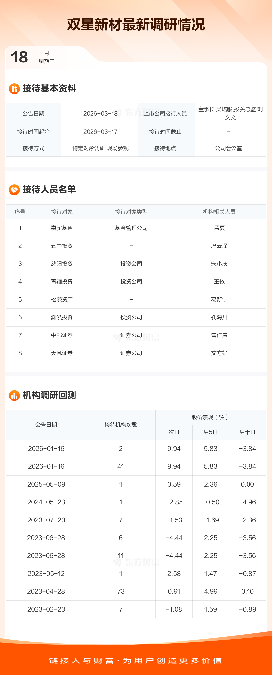 双星新材3月18日公告称,3月17日接待嘉实基金等8家机构调研。接待人员包括董事长 吴培服,投关总监 刘文文。