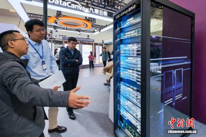 3月18日,天津,观众在首次设置的天津国际算力基础设施与应用展区参观超节点服务器。当日,第22届中国(天津)国际装备制造业博览会在国家会展中心(天津)启幕。中新社记者佟郁摄