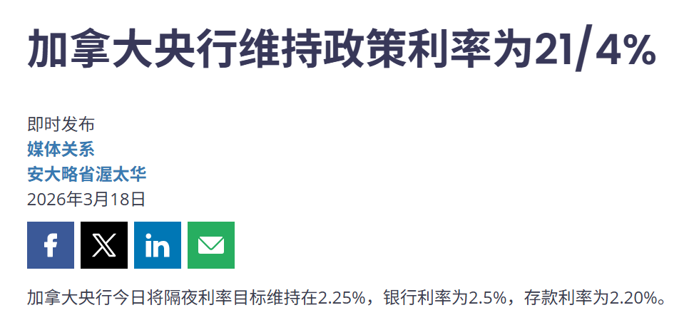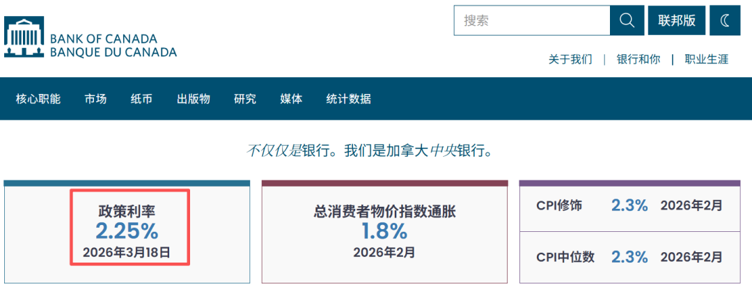【导读】加拿大央行维持2.25%政策利率不变