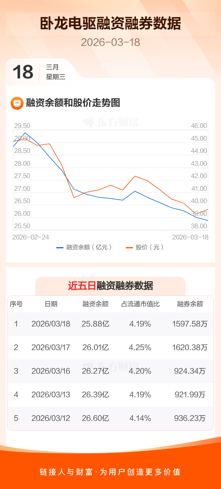 交易所最新数据显示,卧龙电驱于2026年3月18日获融资买入6654.17万元,融资偿还7917.13万元,当日融资净偿还1262.97万元。目前,该股融资余额25.88亿,占流通市值比例为4.19%。