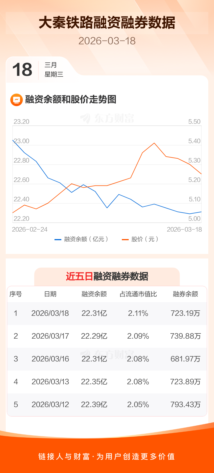 交易所最新数据显示,大秦铁路于2026年3月18日获融资买入6260.18万元,融资偿还6124.53万元,当日融资净买入135.65万元。目前,该股融资余额22.31亿,占流通市值比例为2.11%。
