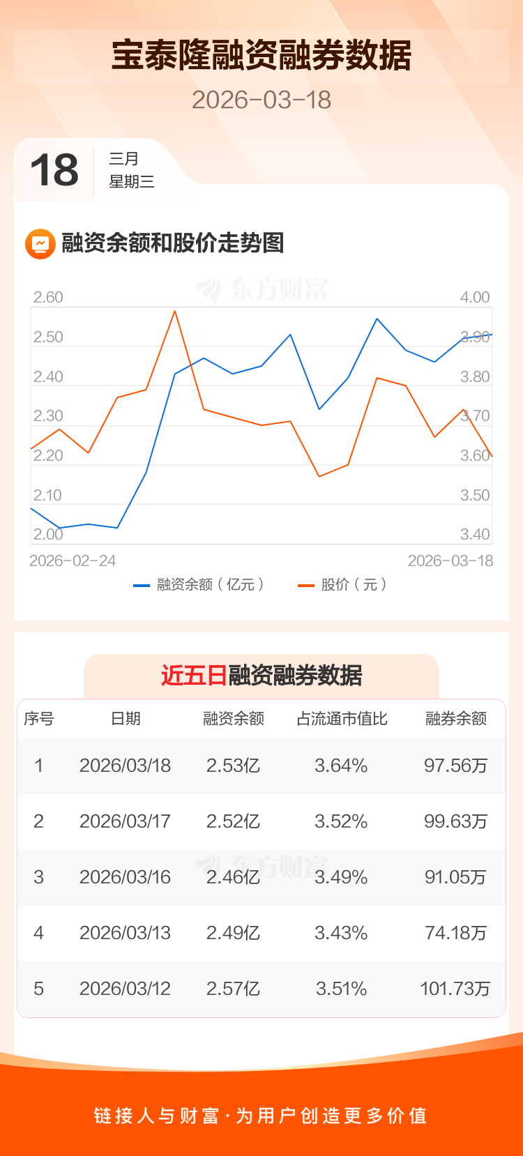 交易所最新数据显示,宝泰隆于2026年3月18日获融资买入3144.07万元,融资偿还3072.28万元,当日融资净买入71.79万元。目前,该股融资余额2.53亿,占流通市值比例为3.64%。