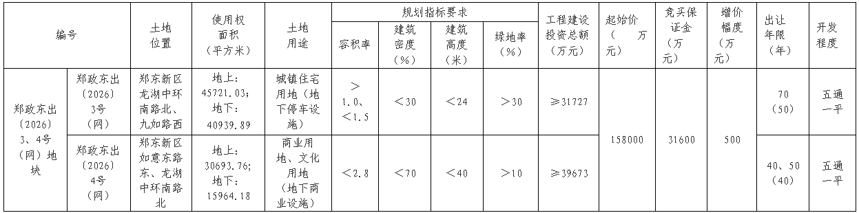 郑政东出〔2026〕4号(网)地块位于郑东新区如意东路东、龙湖中环南路北,地上使用权面积30693.76平方米(约46.04亩),为商业用地、文化用地,要求容积率<2.8,建筑高度不超过40米,工程建设投资总额不低于3.96亿元。
