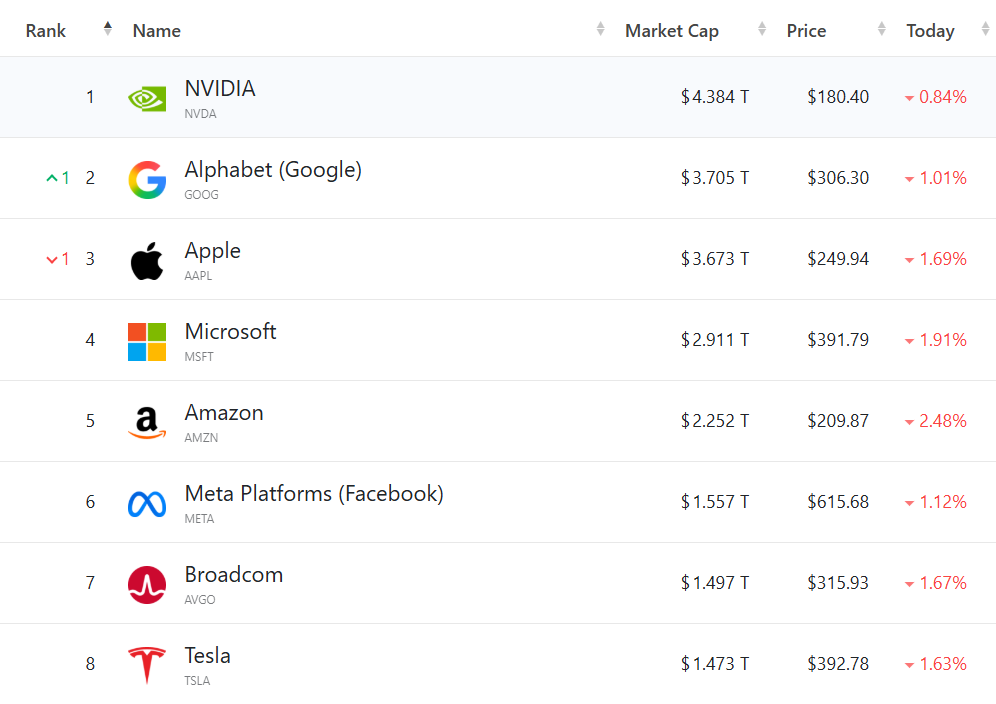 大型科技股集体下跌,(按市值排列)英伟达跌0.84%,谷歌C跌1.01%,苹果跌1.69%,微软跌1.91%,亚马逊跌2.48%,Meta跌1.12%,博通跌1.67%,特斯拉跌1.63%。