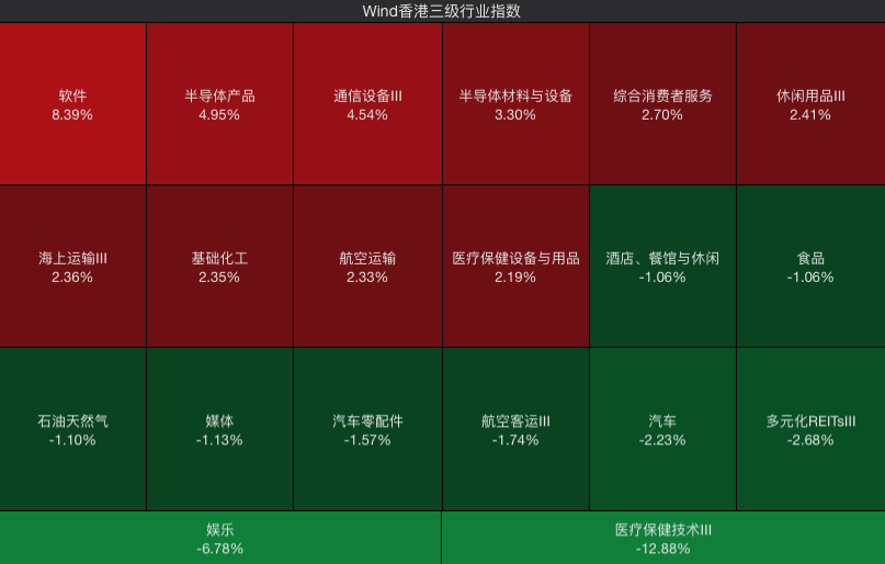 分板块来看,Wind香港三级行业指数中,涨幅前三为: