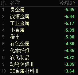 贵金属、能源金属、工业金属、小金属等板块跌幅靠前,均跌超5%。