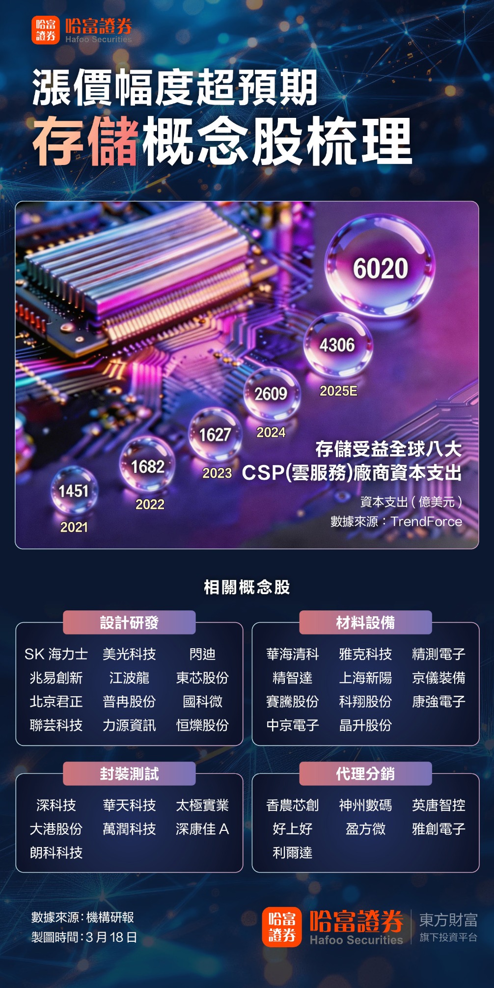 AI服务器强劲需求是本轮存储涨价的最主要原因。根据第三方机构TrendForce数据,2025年全球八大云服务提供商(CSP)资本支出总额年增率达65%,预计2026年资本开支总额达6020亿美元,增速在40%左右的高位。