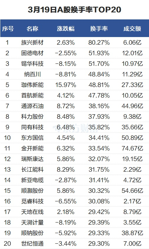 当天换手率最高的个股为族兴新材,全天换手率80.27%。固德电材紧随其后,全天换手率51.93%。