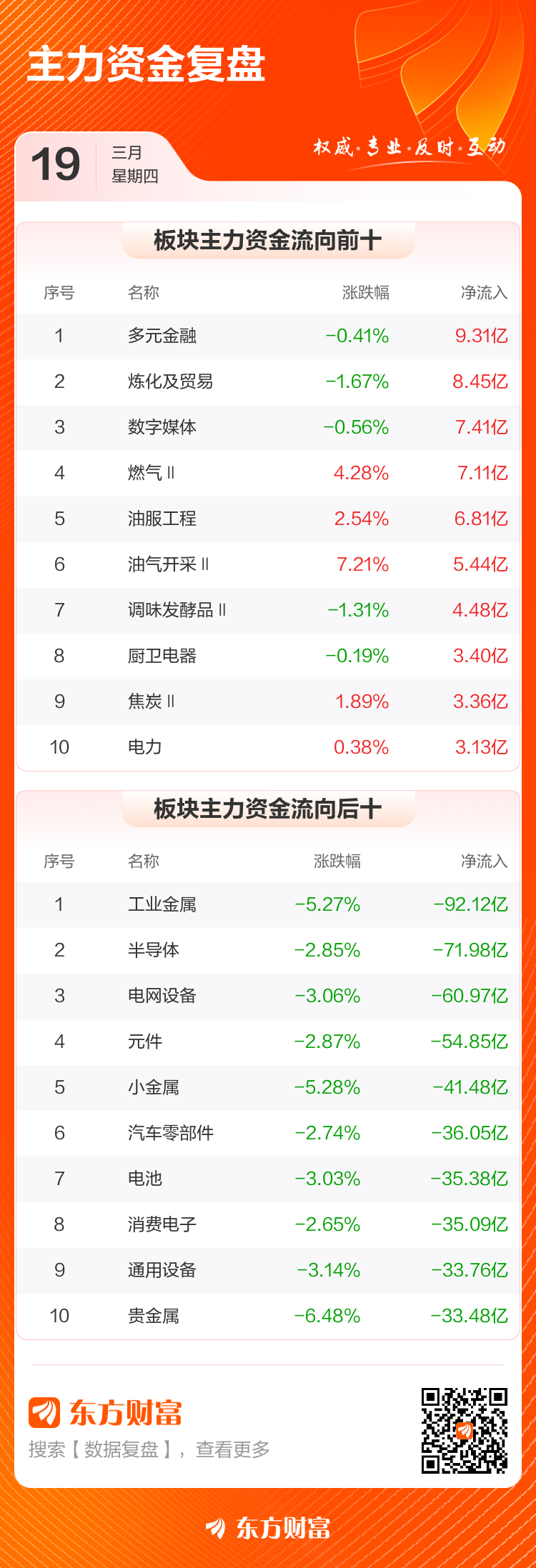 3月19日,沪指跌1.39%,深成指跌2.02%,创业板指跌1.11%。两市成交额2.11万亿,较上个交易日放量649亿。数据显示,今日大盘主力资金净流出1079.04亿。多元金融、炼化及贸易、数字媒体等板块主力资金流入排名居前,其中多元金融净流入9.31亿元。