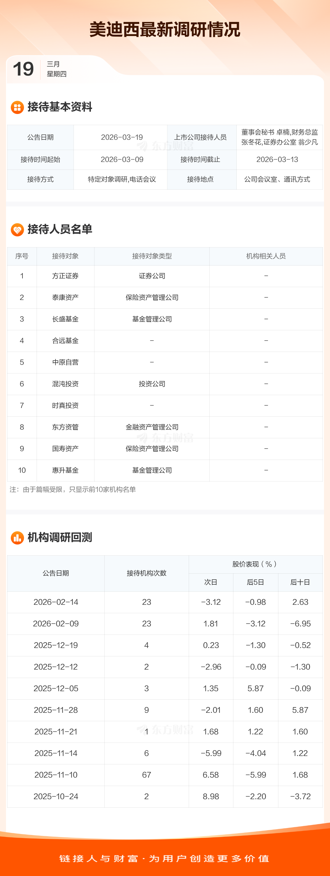 美迪西3月19日公告称,3月9日至3月13日接待方正证券等19家机构调研。接待人员包括董事会秘书 卓楠,财务总监 张冬花,证券办公室 翁少凡。