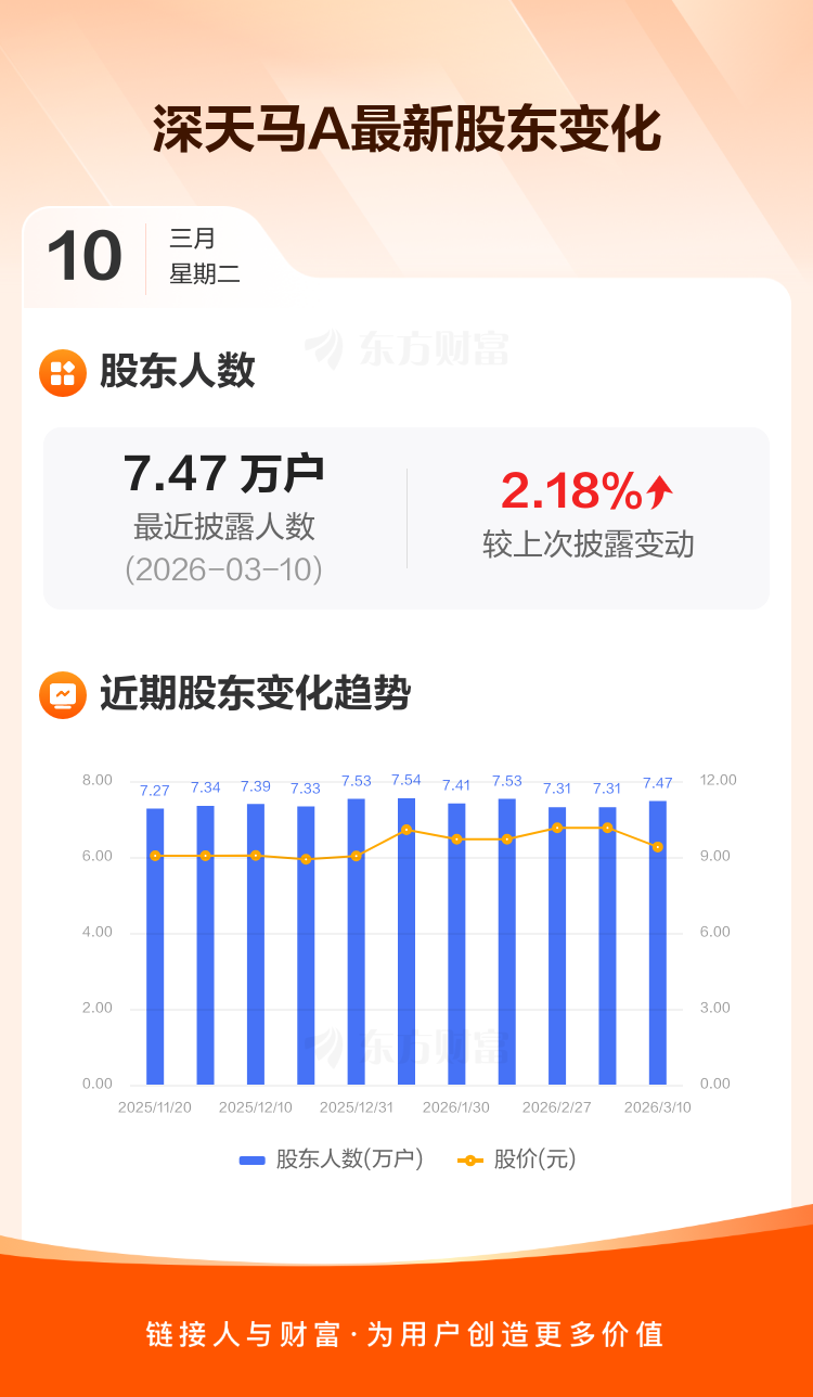 深天马A最新披露数据显示,截至3月10日公司股东户数为7.47万户,较上期(2026年2月28日)增加1593户,增幅为2.18%。户均持有流通股数量由上期的3.36万股下降至3.29万股,户均持股金额由上期的34.12万元减少至30.89万元。