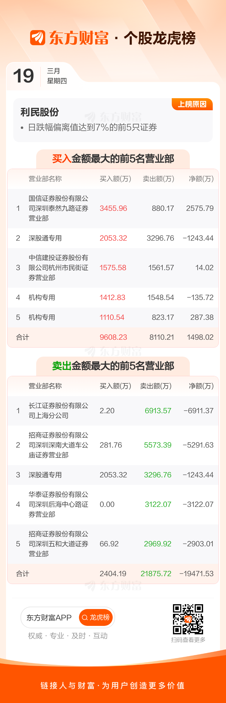 交易所2026年3月19日公布的交易公开信息显示,利民股份因成为日跌幅偏离值达到7%的前5只证券上榜。利民股份当日收报18.55元,涨跌幅-10.00%,偏离值-7.73%,换手率13.67%,成交额11.38亿。